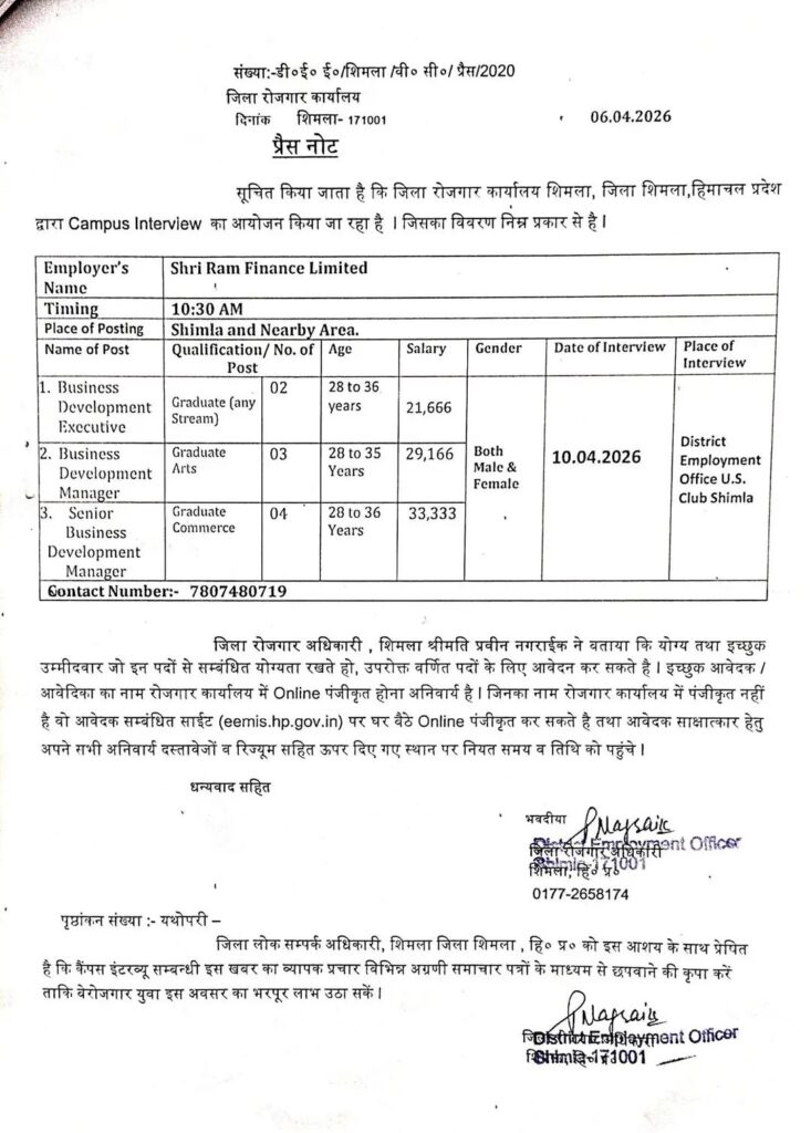 जिला रोजगार कार्यालय शिमला, हिमाचल प्रदेश द्वारा Shri Ram Finance Limited के लिए कैंपस इंटरव्यू आयोजित किया जा रहा है। इस इंटरव्यू के माध्यम से विभिन्न पदों पर भर्ती की जाएगी। इच्छुक और योग्य उम्मीदवार निर्धारित तिथि पर इंटरव्यू में भाग ले सकते हैं।